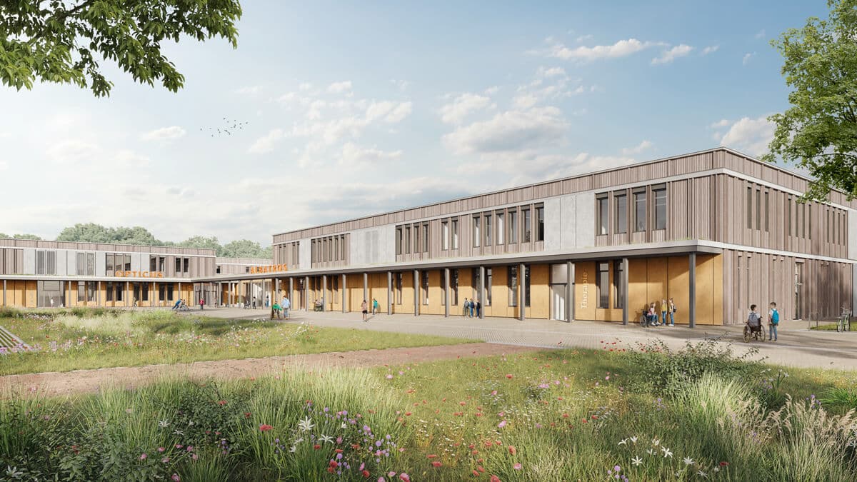 Die Ersatzneubauten der beiden Förderschulen Albatros- und Opticus-Schule am Standort Bielefeld Senne lassen die bereits bestehenden Gebäude sowie die zukünftig neu entstehenden Gebäude zu einem gemeinsamen Bildungscampus zusammenwachsen. Hierzu werden die beiden Schulen als eigenständige und prägnante Häuser winkelartig um einen gemeinsamen Vorplatz angeordnet und verbinden dadurch die Bestandsgebäude zu einem Ensemble. Über den begrünten Vorplatz aus werden alle Campusbausteine klar adressiert und erschlossen. Ergänzend zu den beiden Schulersatzneubauten werden das Beratungshaus Inklusion sowie die LWL Schulverwaltung Bielefeld innerhalb der Opticus Schule auf dem Gelände untergebracht. Der besonderen Art und Weise des Ankommens über Kleintransporter wird durch ein großzügiges, umlaufendes Vordach Rechnung getragen, das ein wettergeschütztes Ankommen der Schüler sicherstellt und zudem die Eingangsseite klar markiert.